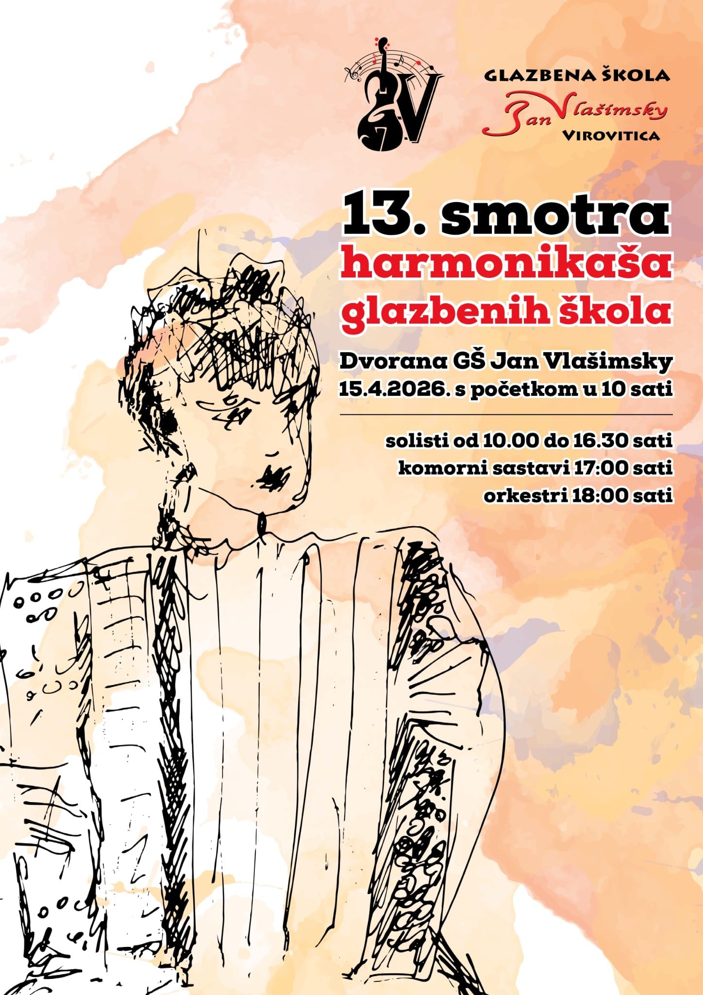 13. Smotra harmonikaša glazbenih škola, 15. travnja 2026., Virovitica SOLISTI A kategorija Lukas Piria Lana Mati Mentor: Marija Plentaj, prof. savjetnica B kategorija Emil Mihajlović
