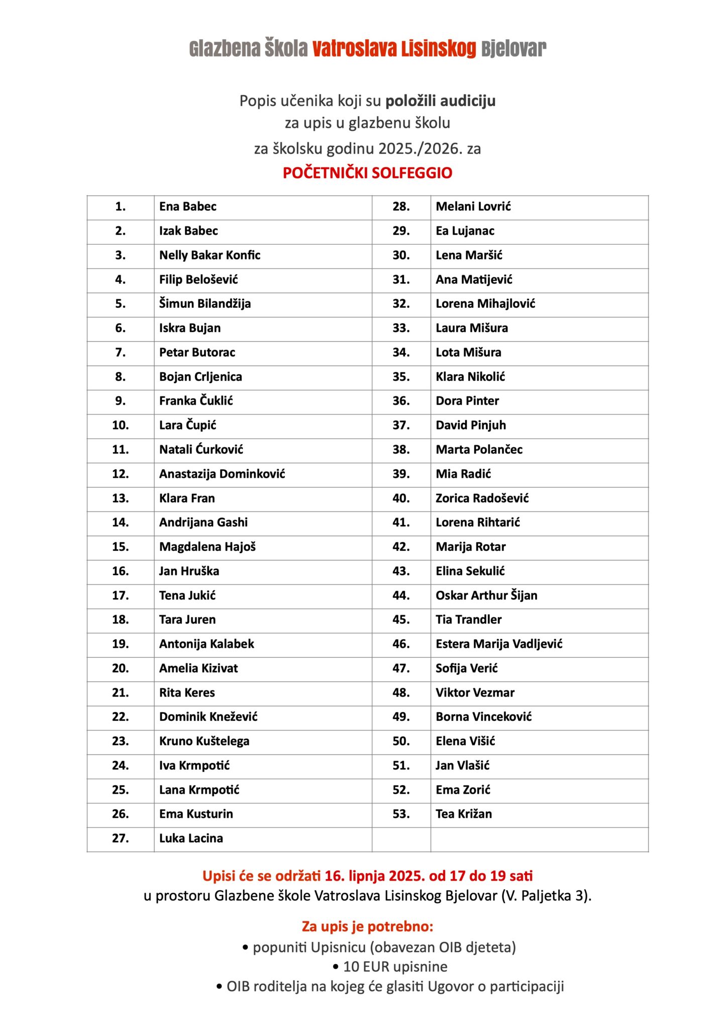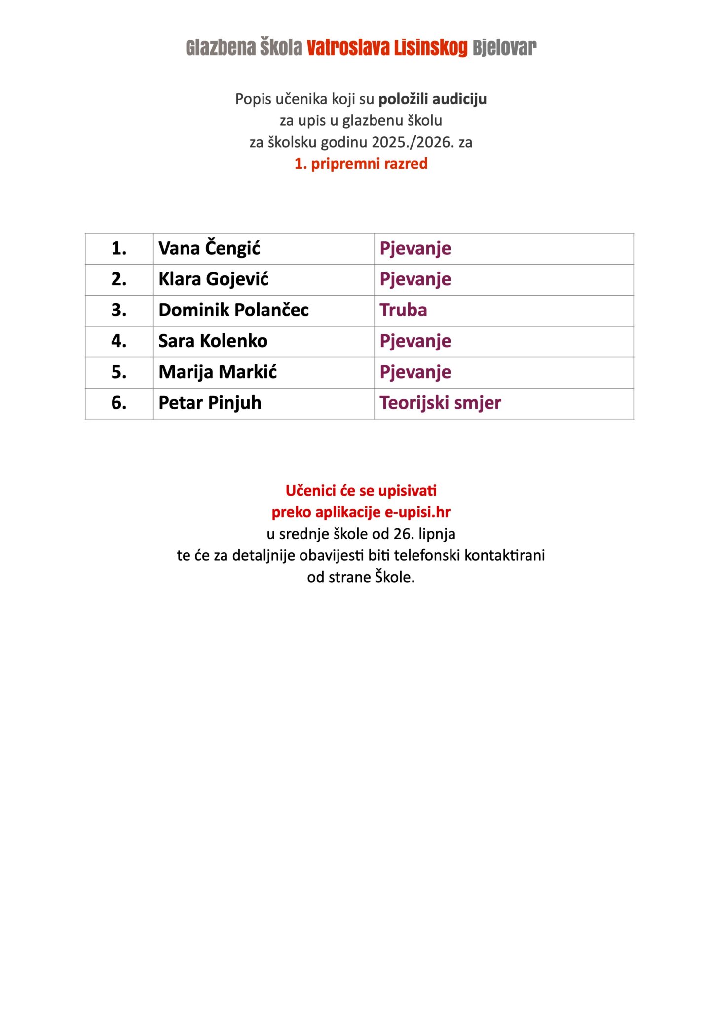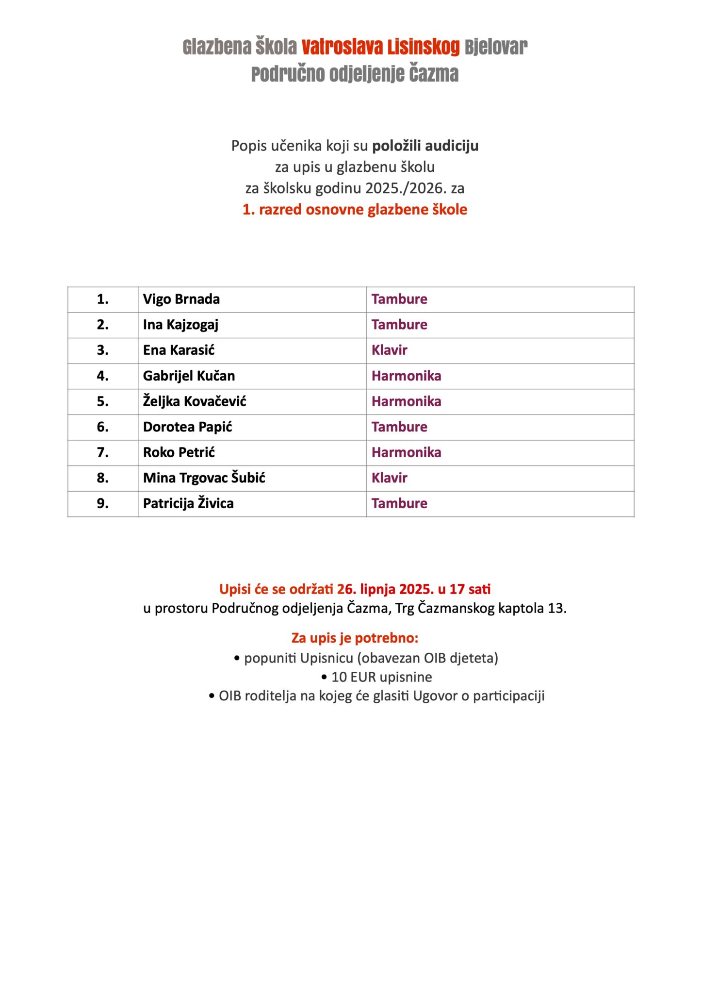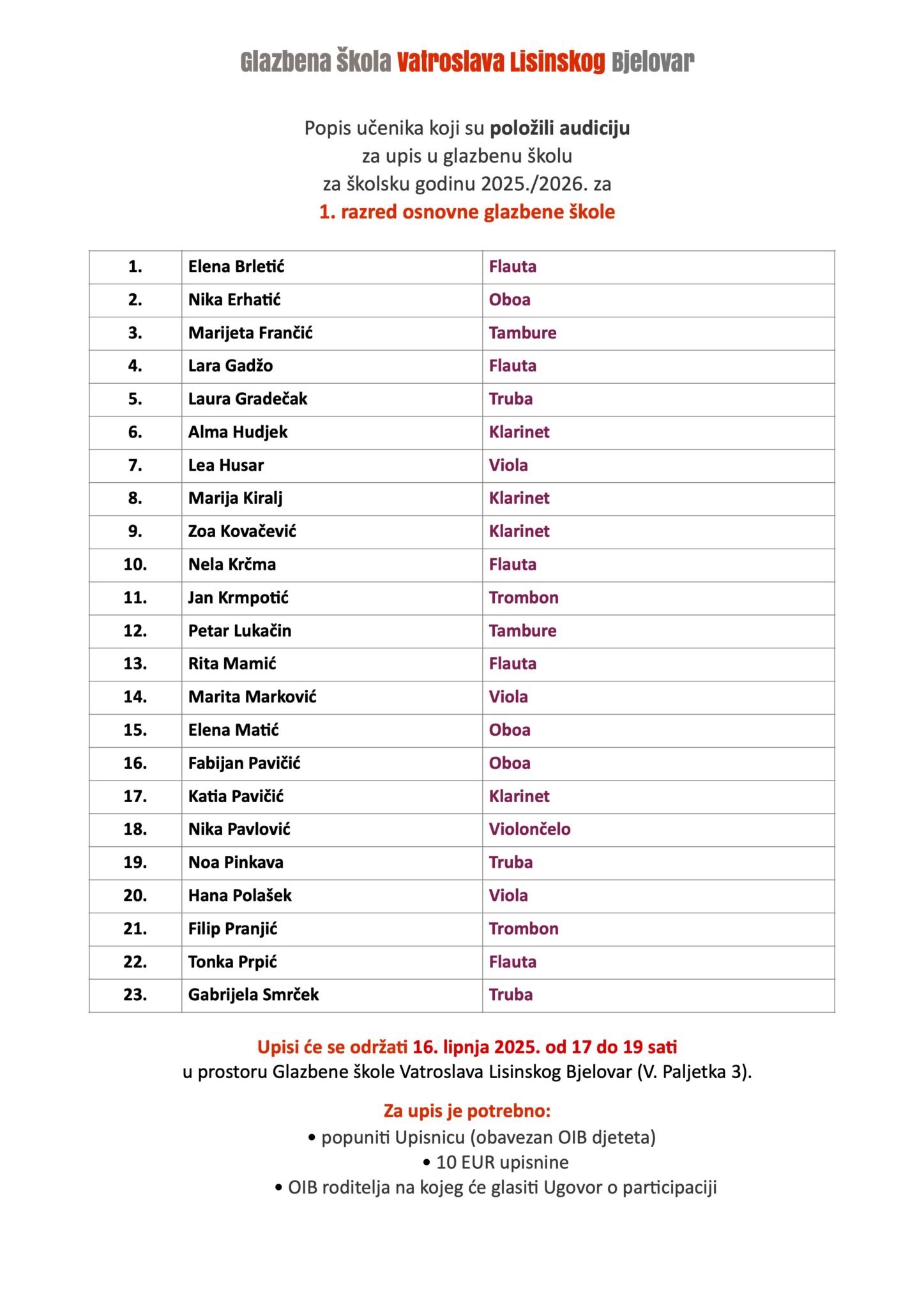 Rezultati audicija za upis u glazbenu školu za školsku godinu 2024./2025.