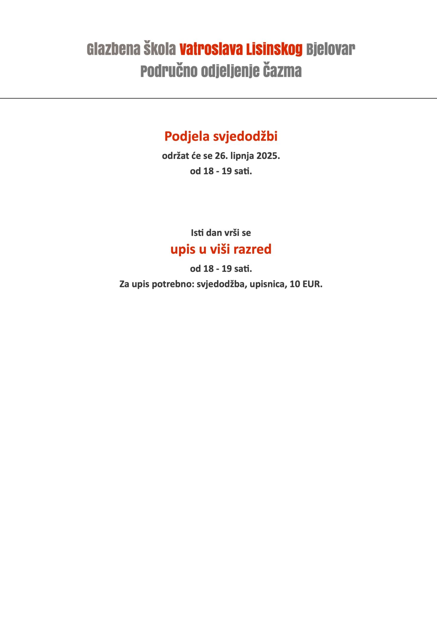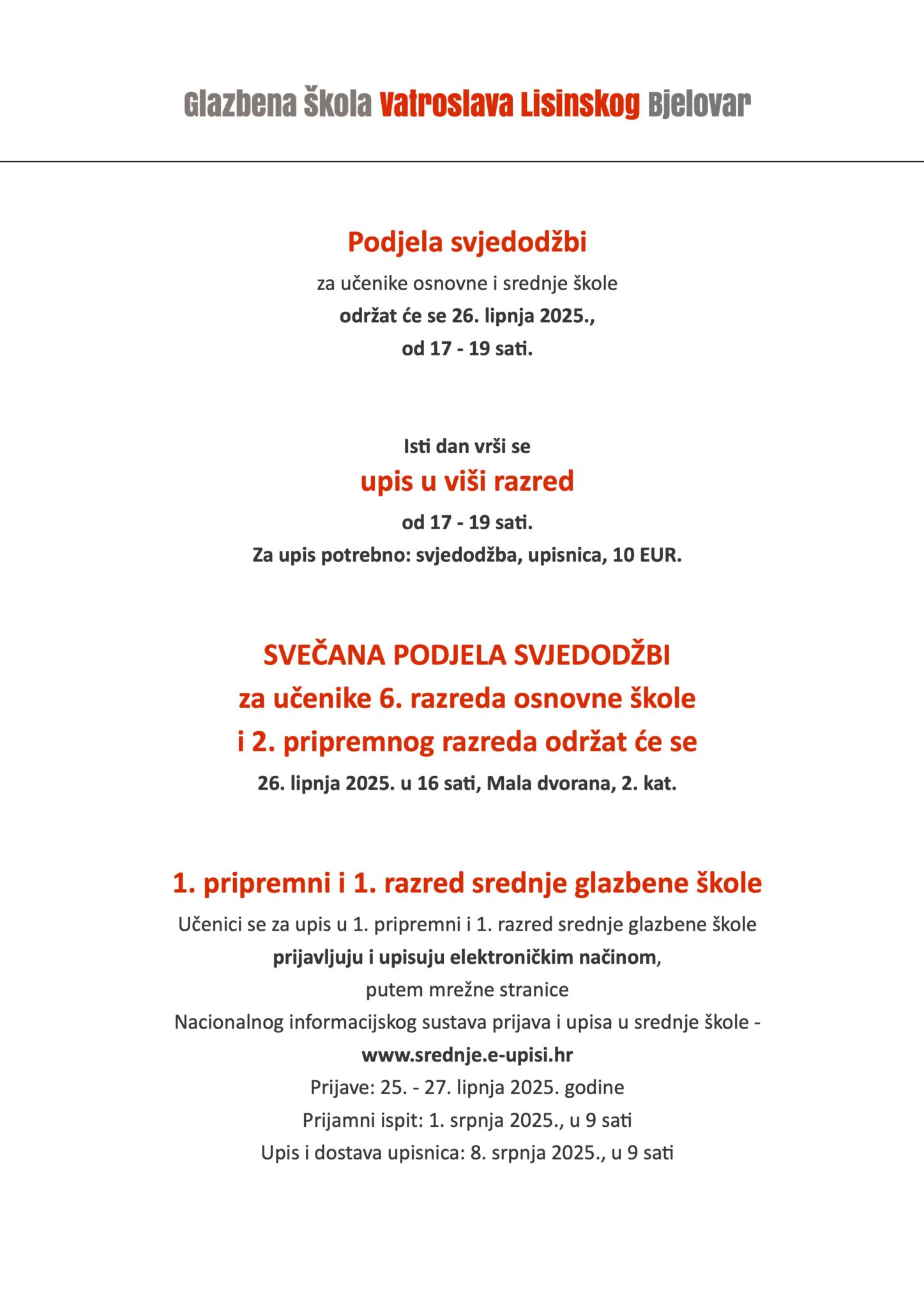 Termini podjele svjedodžbi i upisa u viši razred – 26.06.2025.
