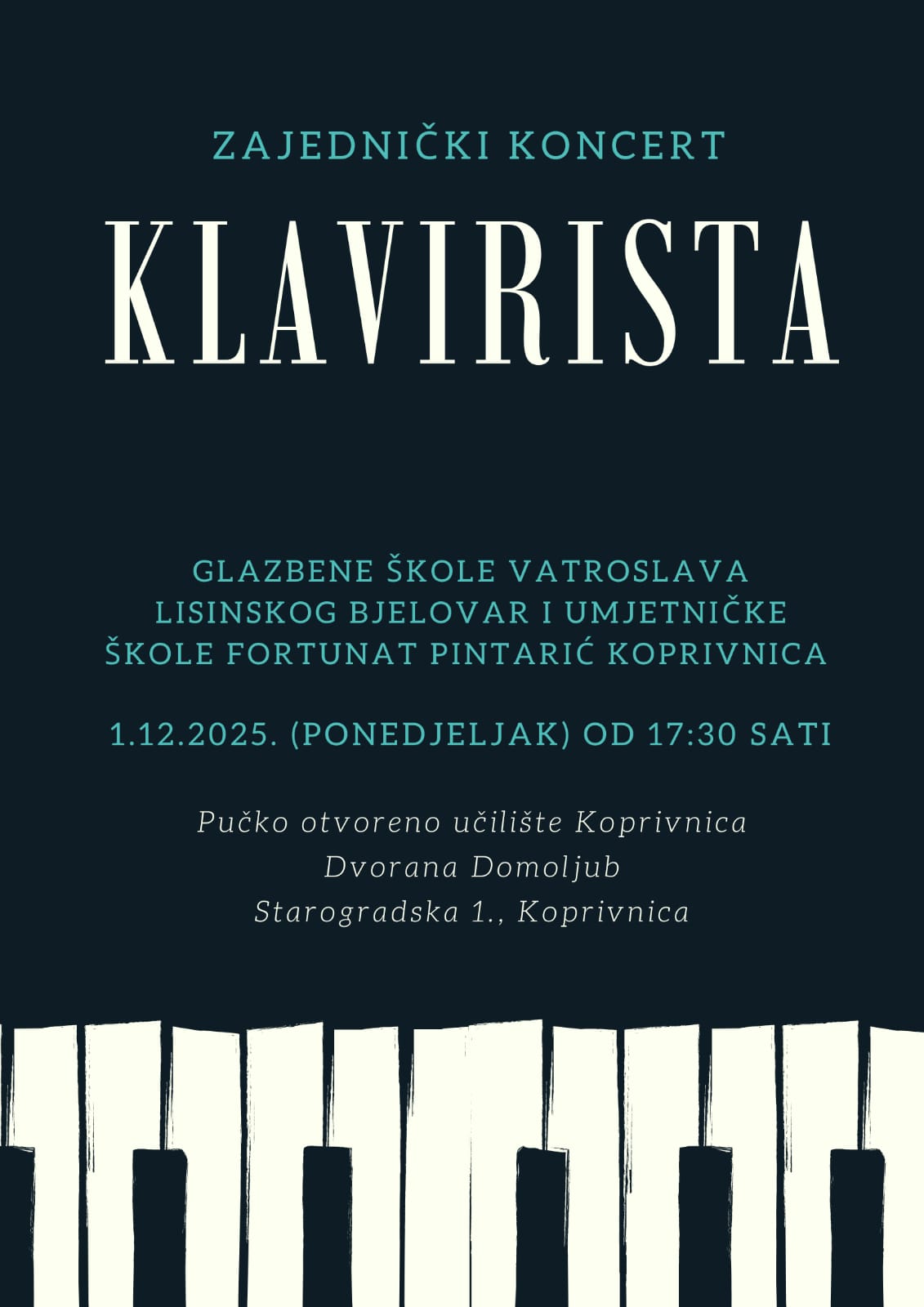 Dana 1. prosinca 2025., u dvorani “Domoljub”, u Koprivnici, održan je Zajednički koncert klavirista Glazbene škole Vatroslava Lisinskog iz Bjelovara i Umjetničke škole Fortunat Pintarić iz Koprivnice. Na koncertu je izvedeno 20-tak točaka, a kako je to izgledalo pogledajte u galeriji slika.