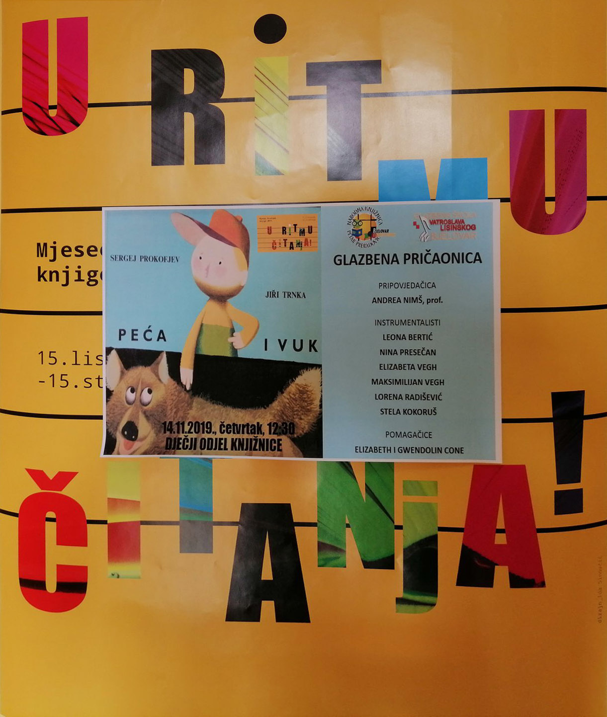 Danas smo na Dječjem odjelu nastavili U RITMU ČITANJA. U suradnji s Glazbenom školom Vatroslava Lisinskog Bjelovar ispričali i odsvirali poznatu glazbenu bajku Sergeja Sergejeviča Prokofjeva “Peća i vuk”. U programu su sudjelovali nastavnica Glazbene škole Andrea Nimš, prof. te učenici Lorena Radičević, Leona Bertić, Nina Presečan, Elizabeta i Maksimilijan Vegh, Elizabeth i Gwendolyn Cone te Stela Kokoruš koji su na svojim instrumentima odsvirali poznate teme likova iz bajke. Publika, koju su činili učenici trećih razreda Prve i Treće osnovne škole Bjelovar, sa velikim zanimanjem su pratila glazbeno-pripovjedačku izvedbu, a na kraju su popunjavali radne listiće te ponovili nazive instrumenata koje su imali priliku čuti.